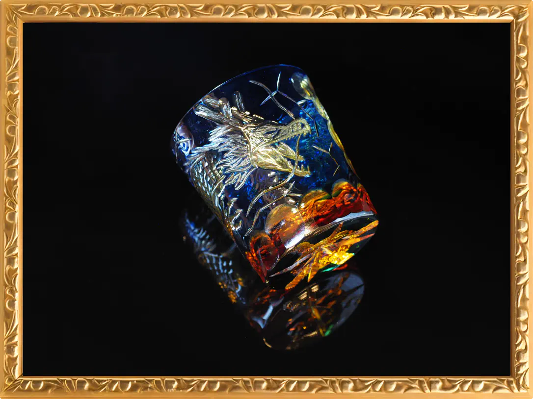 職人の清水氏は、江戸切子の材料では珍しいソーダガラスを使用し、全て伝統的な技法の手磨きで仕上げられた繊細なカットは、光を美しく反射し、温もりある独特ある輝きを放つ技を持つ。